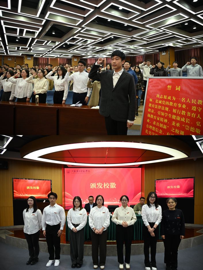 开班式在庄严肃穆的国歌声中拉开帷幕。在学校人工智能与教育现代化研究中心教师林智成的领誓下,全体新入职教师高举右拳,作出庄严宣誓,传递出奉献教育事业的坚定决心。党委常委、副校长赵玉蓉为新教师代表颁发了校徽。
